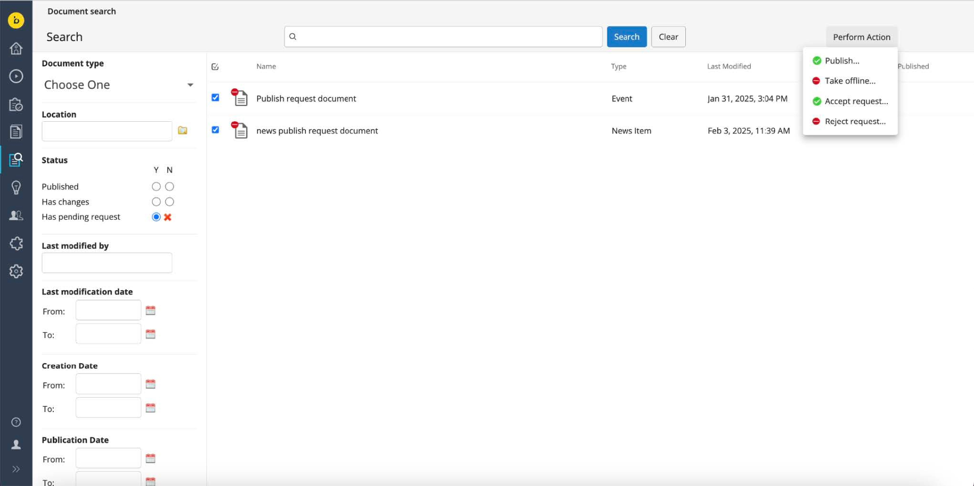 When accessed via the "See all" button, the Document Search page will automatically fetch documents with pending requests, enabling users to publish or take offline all relevant documents directly from the search interface.