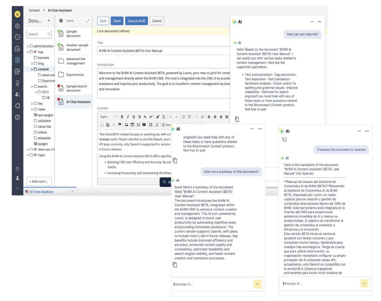 Today's content creation and management often involves time-consuming manual tasks. This new feature AI Content Assistant is designed to act as your co-pilot, helping with repetitive work and boosting your efficiency, quality, and productivity. Powered by Loomi, this assistant seamlessly integrates into the BrXM CMS to bring AI capabilities directly to your content creation workflows