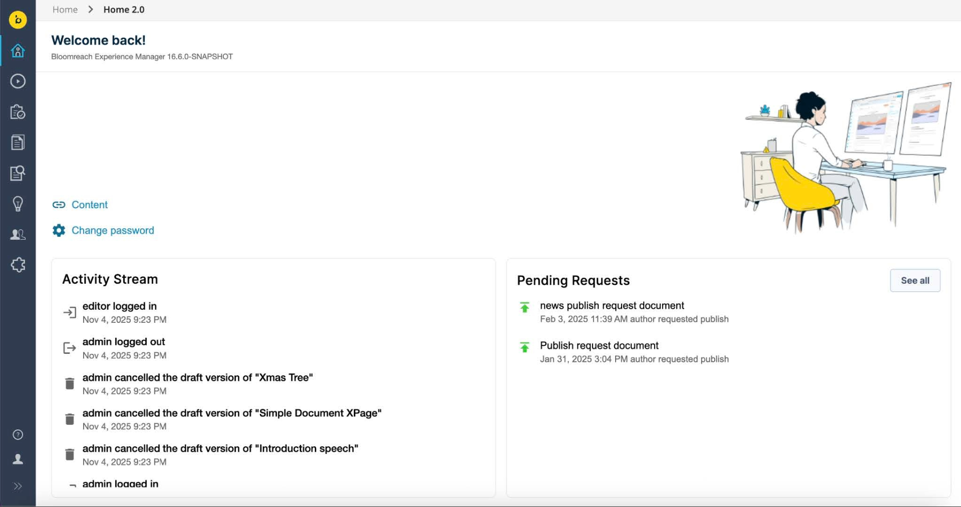 We're excited to announce the launch of Homepage 2.0, a significant step in our mission to modernize the BrXM UI. This release marks a key milestone in replacing our legacy Wicket-based applications. Your feedback and requirements are invaluable as we continue this UI modernization initiative, ensuring we deliver a user-centric experience with the flexibility needed for your unique use cases and customizations.