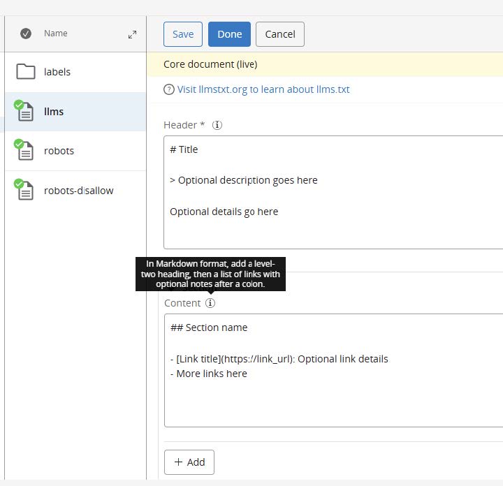 The LLms.txt plugin adds a dedicated document type to CMS, allowing webmasters to manage the contents of llms.txt files, which are used to provide LLMs with human and LLM readable content. See llmstxt.org for more information on the format and purpose of that file. The plugin provides beans and a standard component for retrieving the llms.txt-related data from the content repository, and a sample Freemarker template for rendering that data as a llms.txt file.