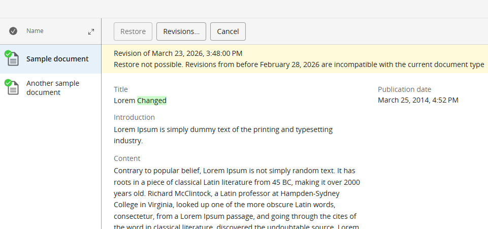 Implementation projects can change their content model and thereby introduce backwards-incompatible changes, for example in a site implementation. Without being able to block document revisions from before such change, it is possible that an editor can restore a document to a state that breaks the latest introduced changes.