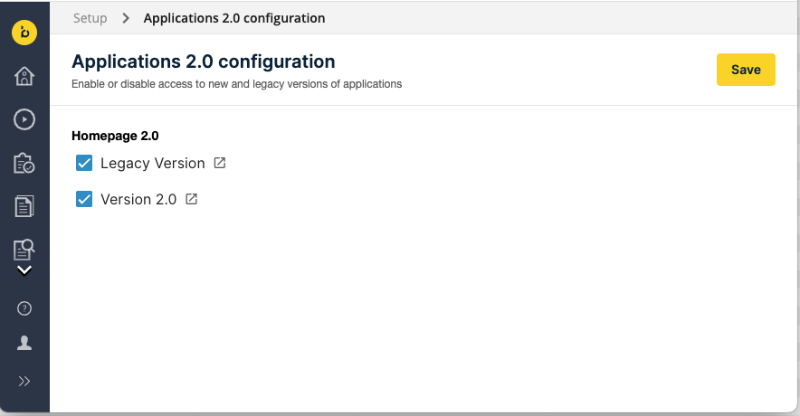 When an App 2.0 is released, both the new and legacy versions are available in the navigation menu and enabled by default, allowing users to switch between them. Users can use either version and provide feedback to help improve the new application.