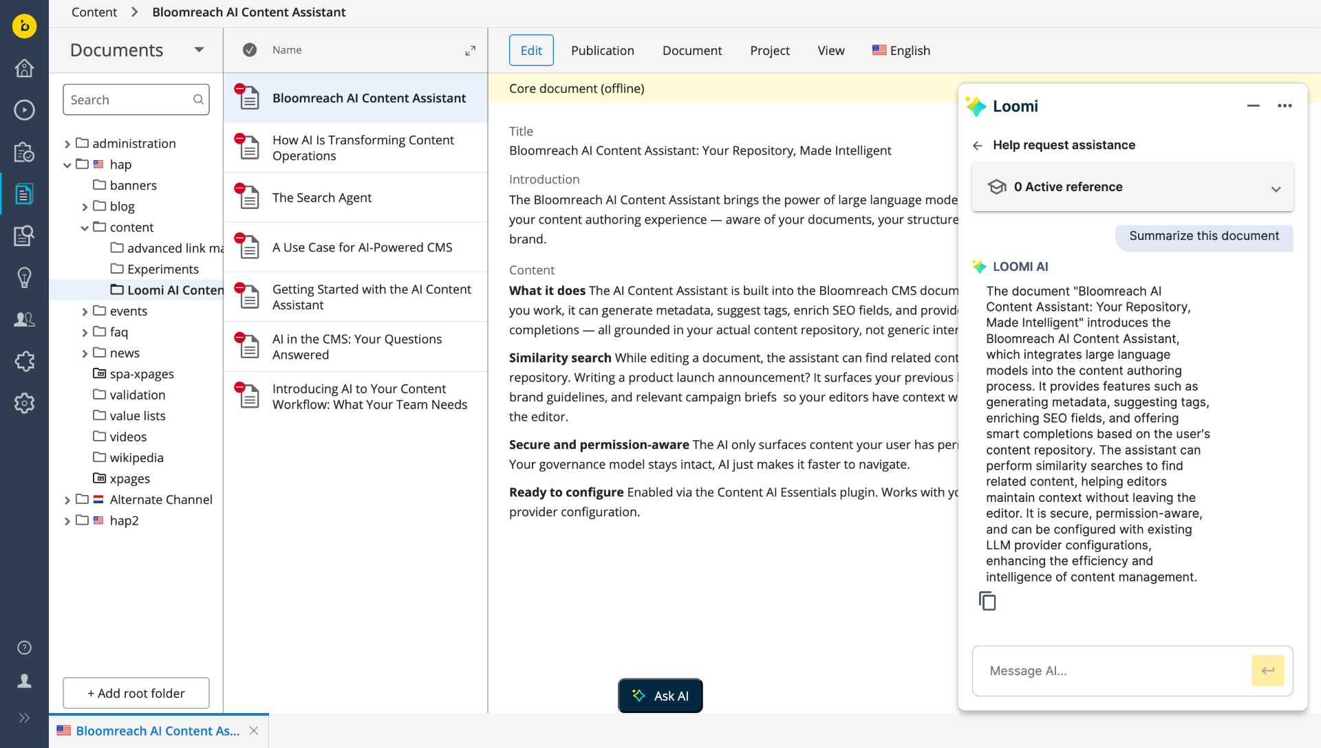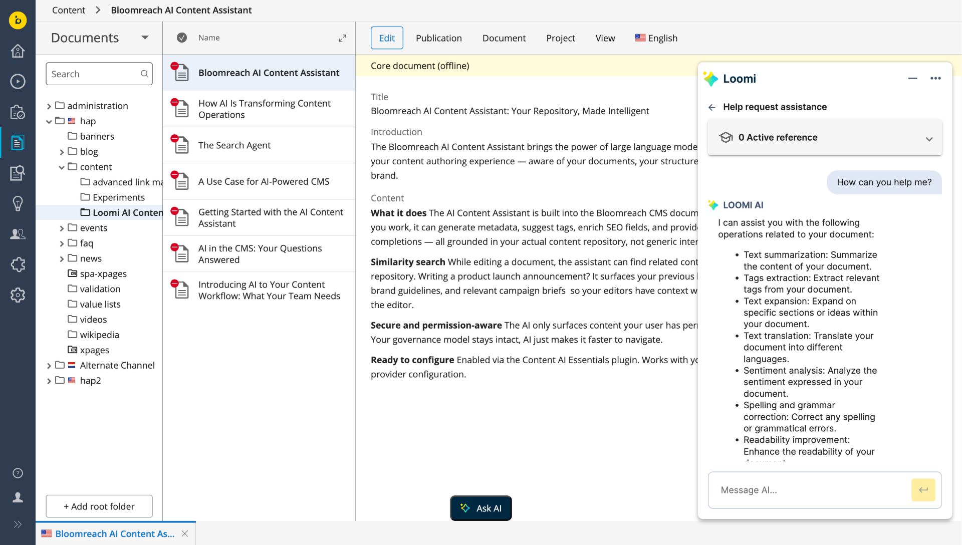 Loomi AI Content Assistant is your AI co-pilot for content creation and management, built directly into the brXM CMS. It opens as a chat panel alongside your document, so you can write faster, edit smarter, and find what you need without leaving the CMS or switching tools.
