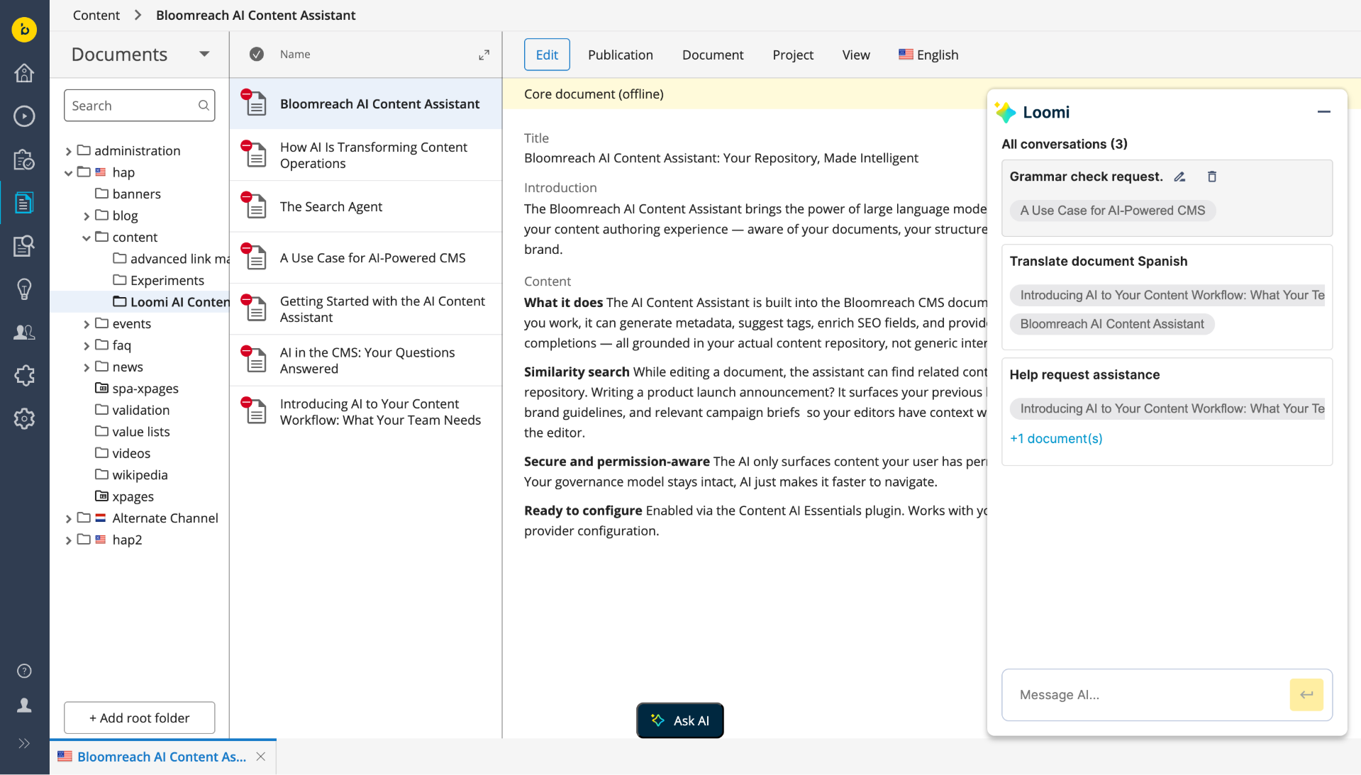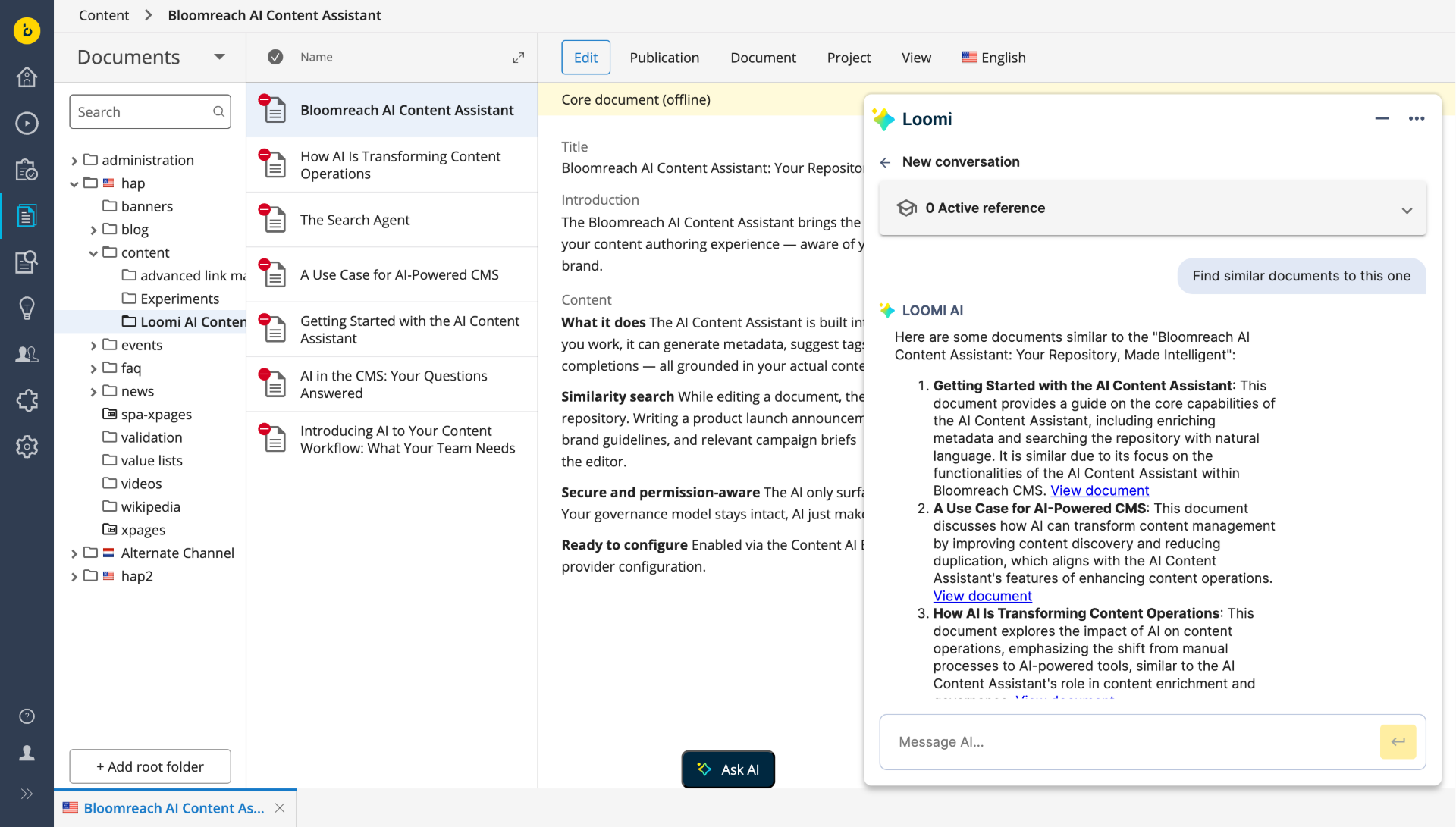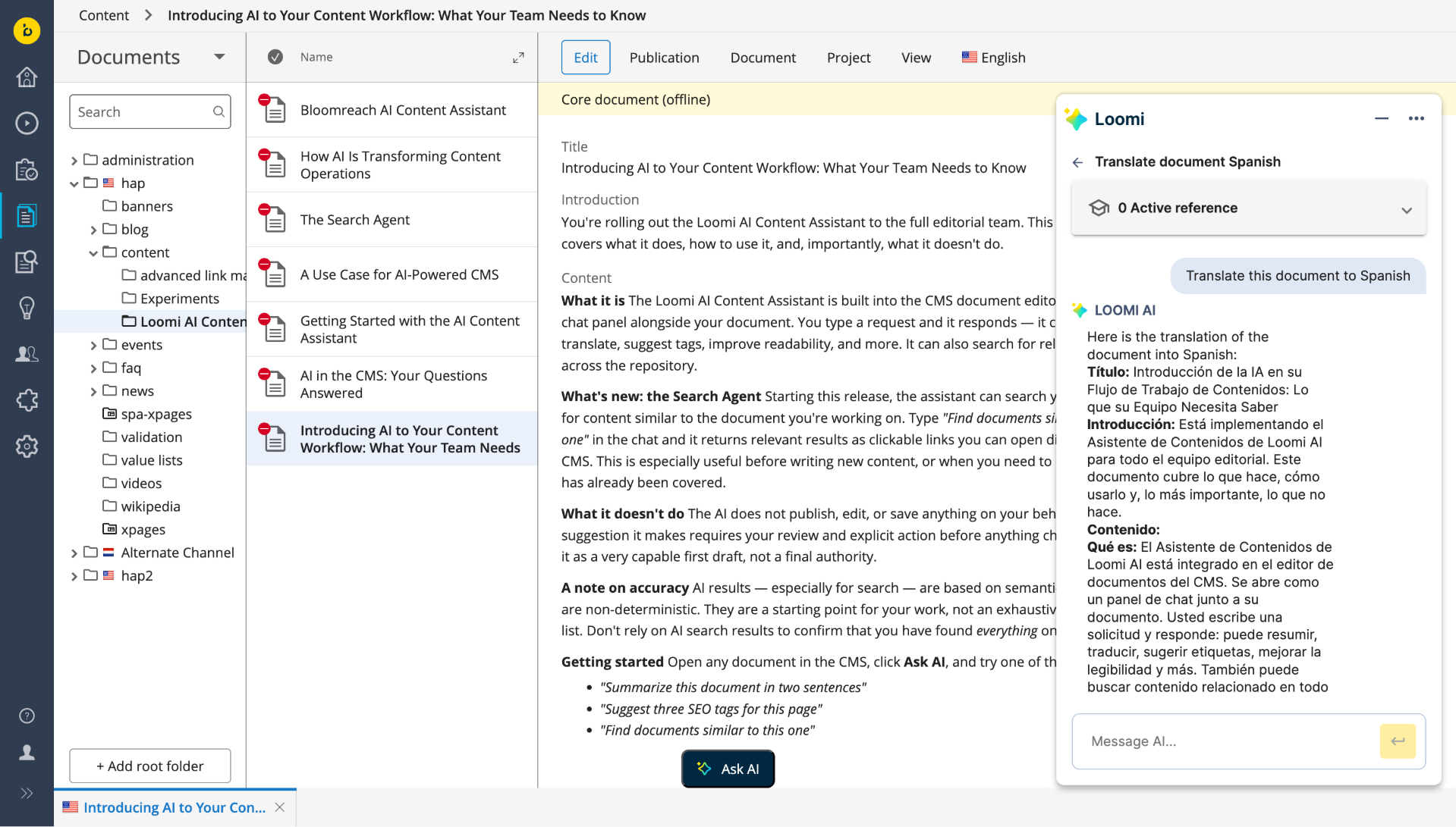 The Loomi AI Content Assistant focuses on the tasks that slow content teams down most: writing, editing, translating, optimizing, and, new in v16.8, finding related content across your entire repository using the Search Agent.