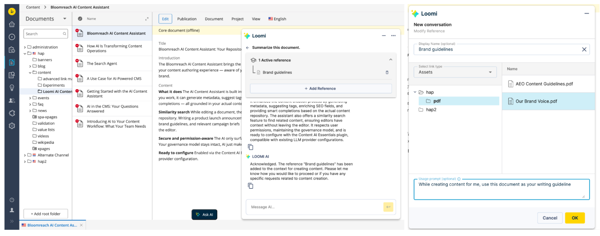 Add references: Expand the context of your conversation by adding documents and PDF assets from your CMS repository.